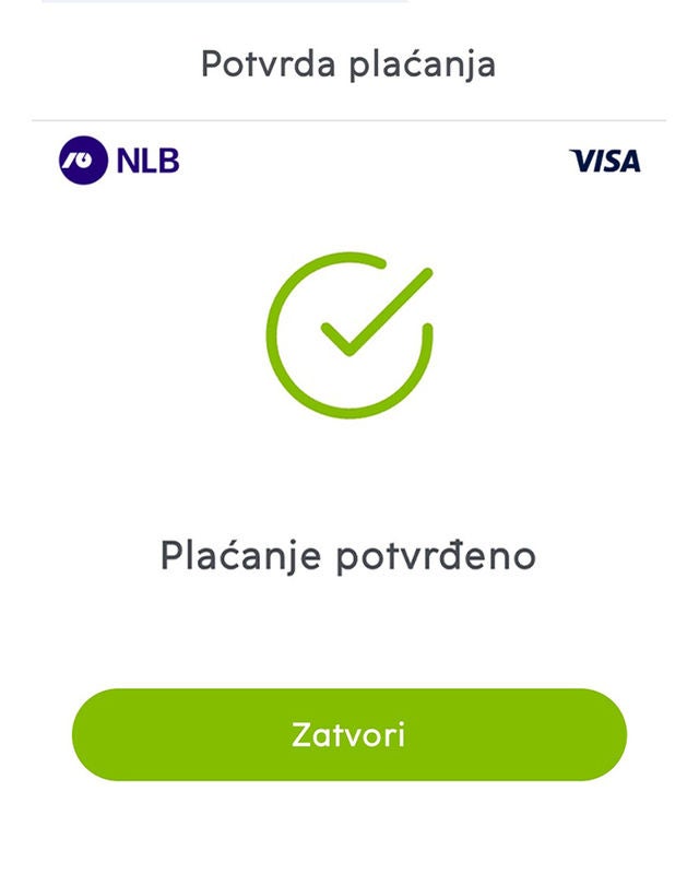 6. Nakon potvrde, prikazuje se ekran da je plaćanje uspešno potvrđeno.