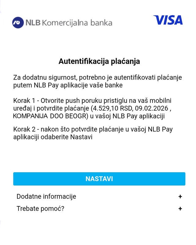 NLB Komercijalna banka u postupku 3D Secure autentifikacije koristi pouzdanu autentifikaciju za potvrdu onlajn plaćanja karticama, kako bi se obezbedila dodatna zaštita Vaših transakcija.