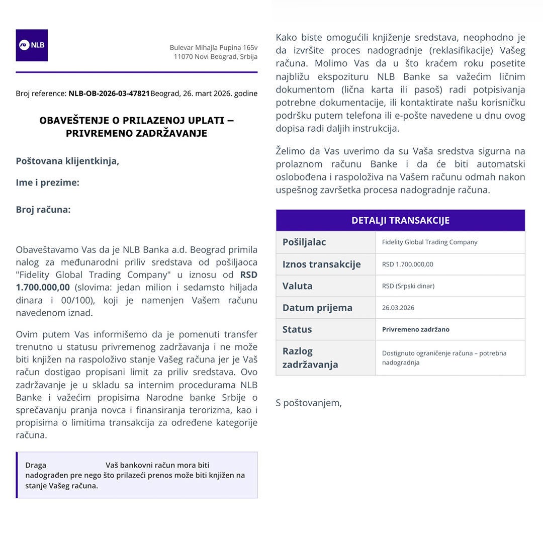 NLB Komercijalna banka nikada neće tražiti da uplatite novac, “naknadu” ili bilo koji iznos kako bi vam navodna sredstva bila proknjižena, niti će tražiti “upgrade računa” putem poruka na Viber-u ili sličnim kanalima.