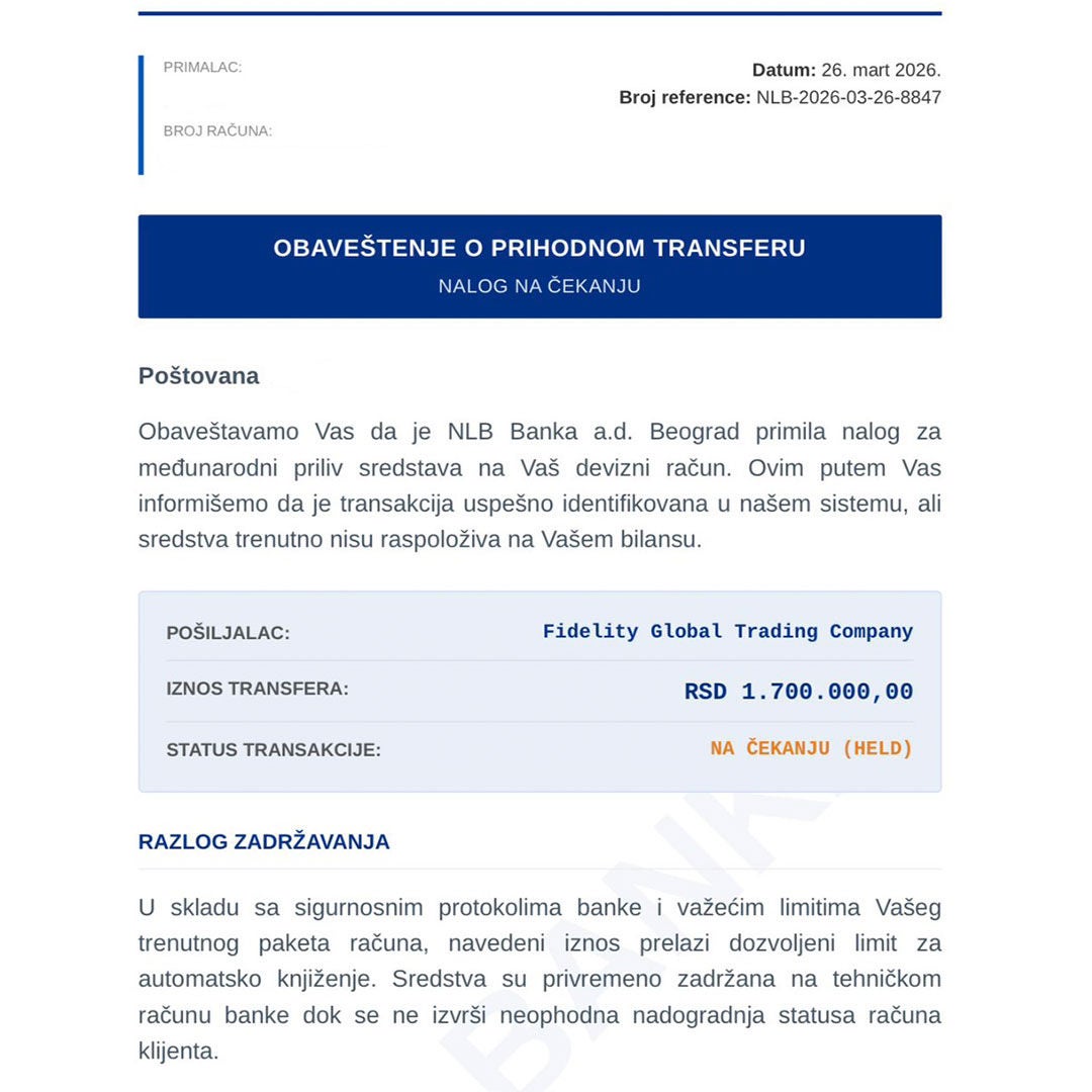 Prevaranti klijentima šalju poruke/obaveštenja o navodnom međunarodnom prilivu sredstava (u ovom slučaju od pošiljaoca „Fidelity Global Trading Company“) uz informaciju da je uplata „privremeno zadržana“ i da je potrebno da se „nadogradi“ (upgrade) račun kako bi sredstva bila knjižena.